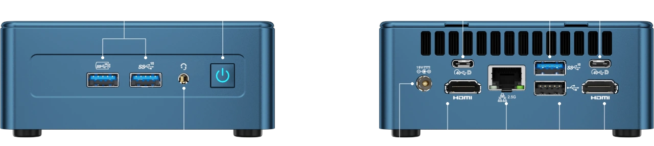 | I/O Ports | 3 × USB 3.2 Gen 2 ports 1 × USB 2.0 port 2 × USB4 ports 1 × SD card reader 1 × 3.5 mm headphone jack 1 × 2.5 GbE LAN port 2 × HDMI ports 1 × DC in 1 × Power button |