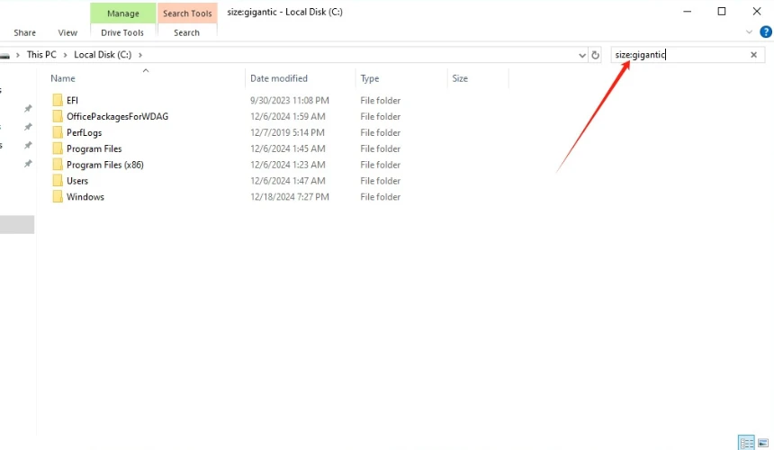 - In the search bar, type “size:gigantic” without the quotes, and then press “Enter.”